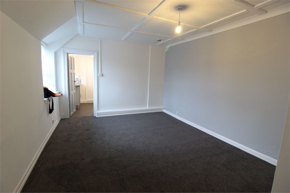 Large room with fitted carpet, modern electric fire, window to front. Door into shower room