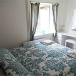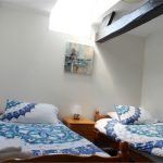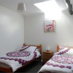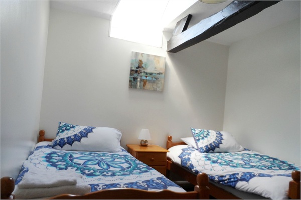 Double bedroom set out woth two single beds, exposed timber beams.