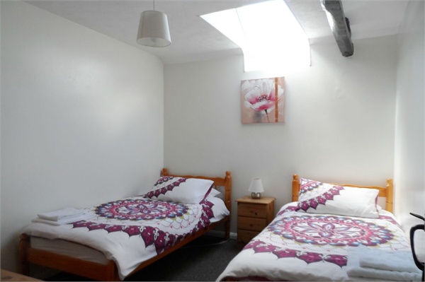 Double bedroom set out with two single beds, exposed timber beams.