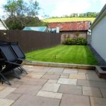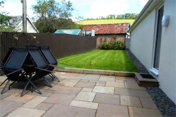 Private garden with patio and lawn.