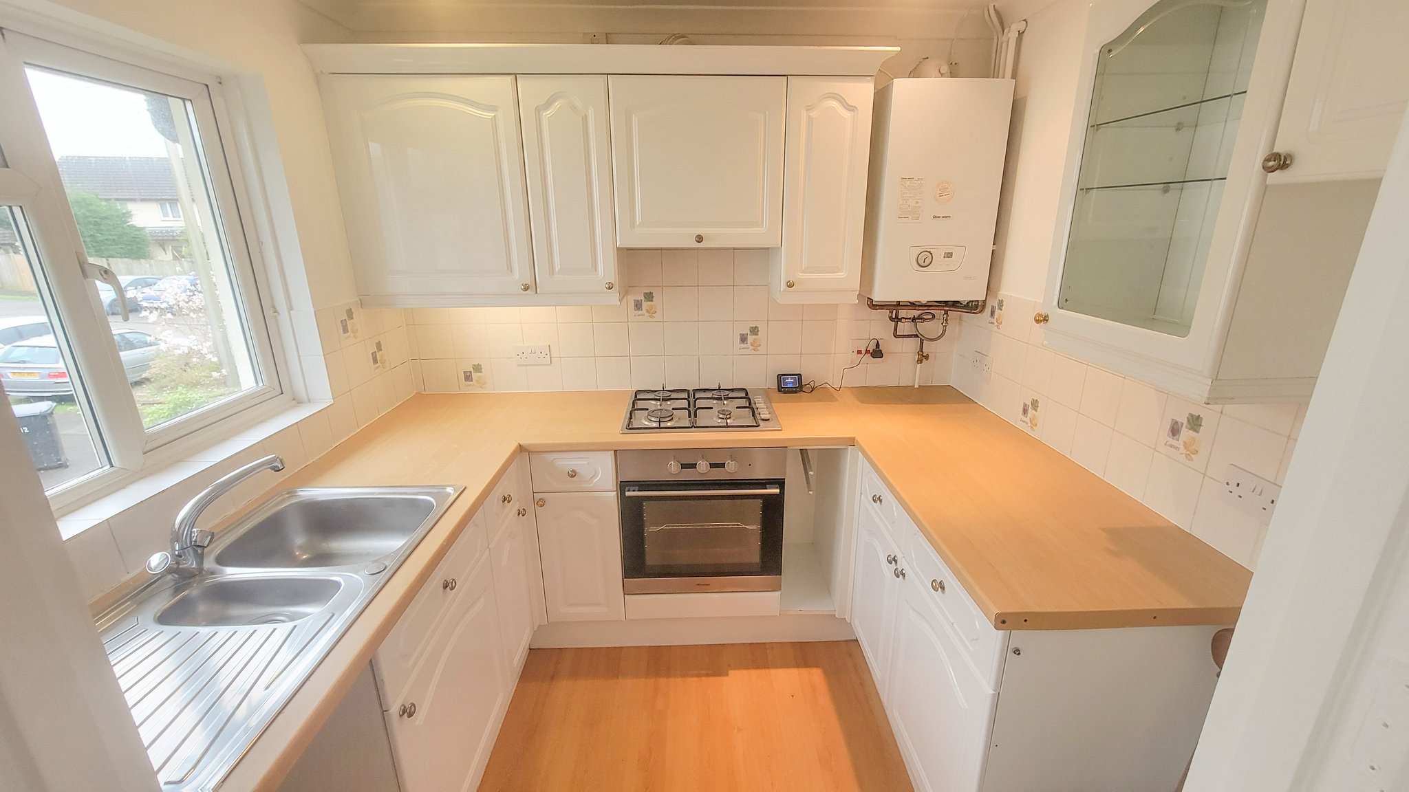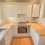 Fitted kitchen with double glazed window to the front, integrated electric oven and gas hob and space for additional appliances.